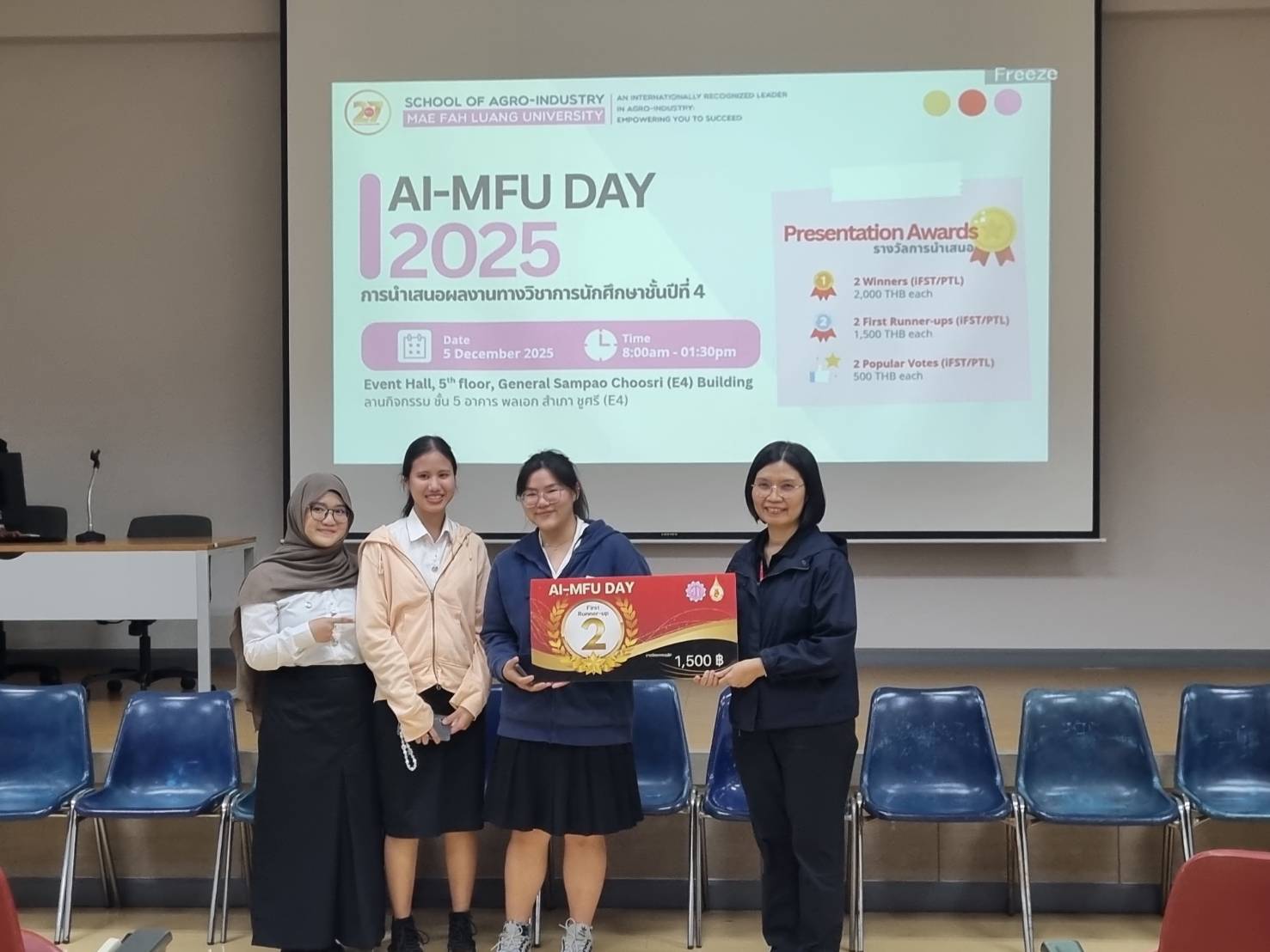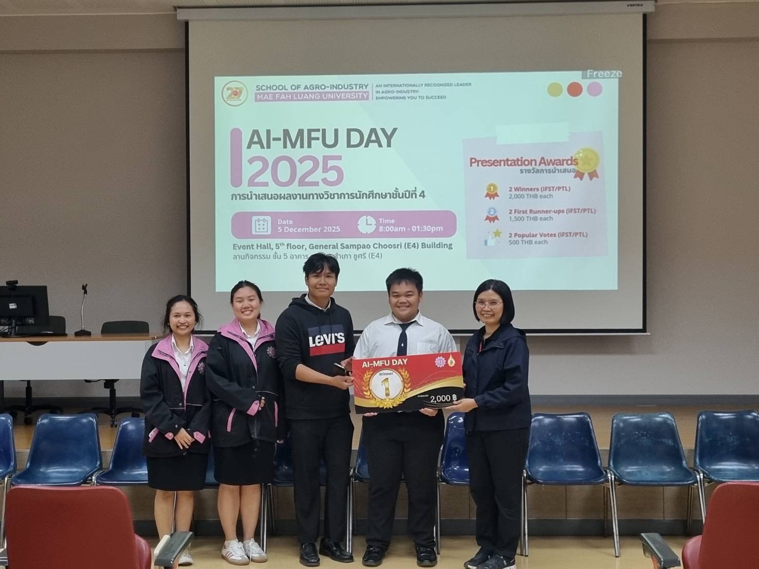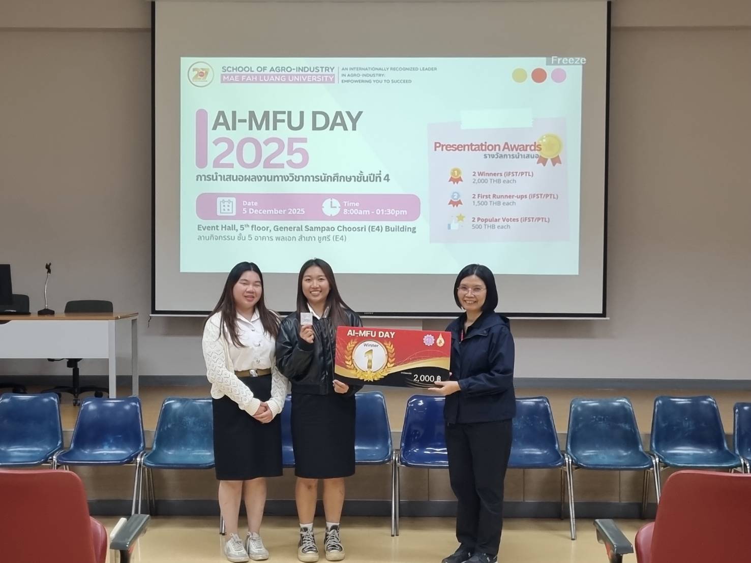สำนักวิชาอุตสาหกรรมเกษตร มหาวิทยาลัยแม่ฟ้าหลวง จัดกิจกรรม AI-MFU DAY 2025 เพื่อนำเสนอผลงานวิชาการของนักศึกษาชั้นปีที่ 4 ประจำปีการศึกษา 2568 เมื่อวันที่ 5 ธันวาคม 2568 ณ ลานกิจกรรม ชั้น 5 อาคารพลเอก สำเภา ชูศรี (E4) โดยบรรยากาศภายในงานเป็นไปอย่างเข้มข้นและสร้างสรรค์ สะท้อนให้เห็นถึงศักยภาพของนักศึกษาในการพัฒนาองค์ความรู้ด้านอุตสาหกรรมเกษตรสู่ระดับสากล ภายในงานมีการประกาศผลรางวัลผลงานนำเสนอยอดเยี่ยม (Presentation Awards) ประจำปีการศึกษา 2568 ซึ่งมีรายชื่อนักศึกษาที่ได้รับรางวัล ดังนี้