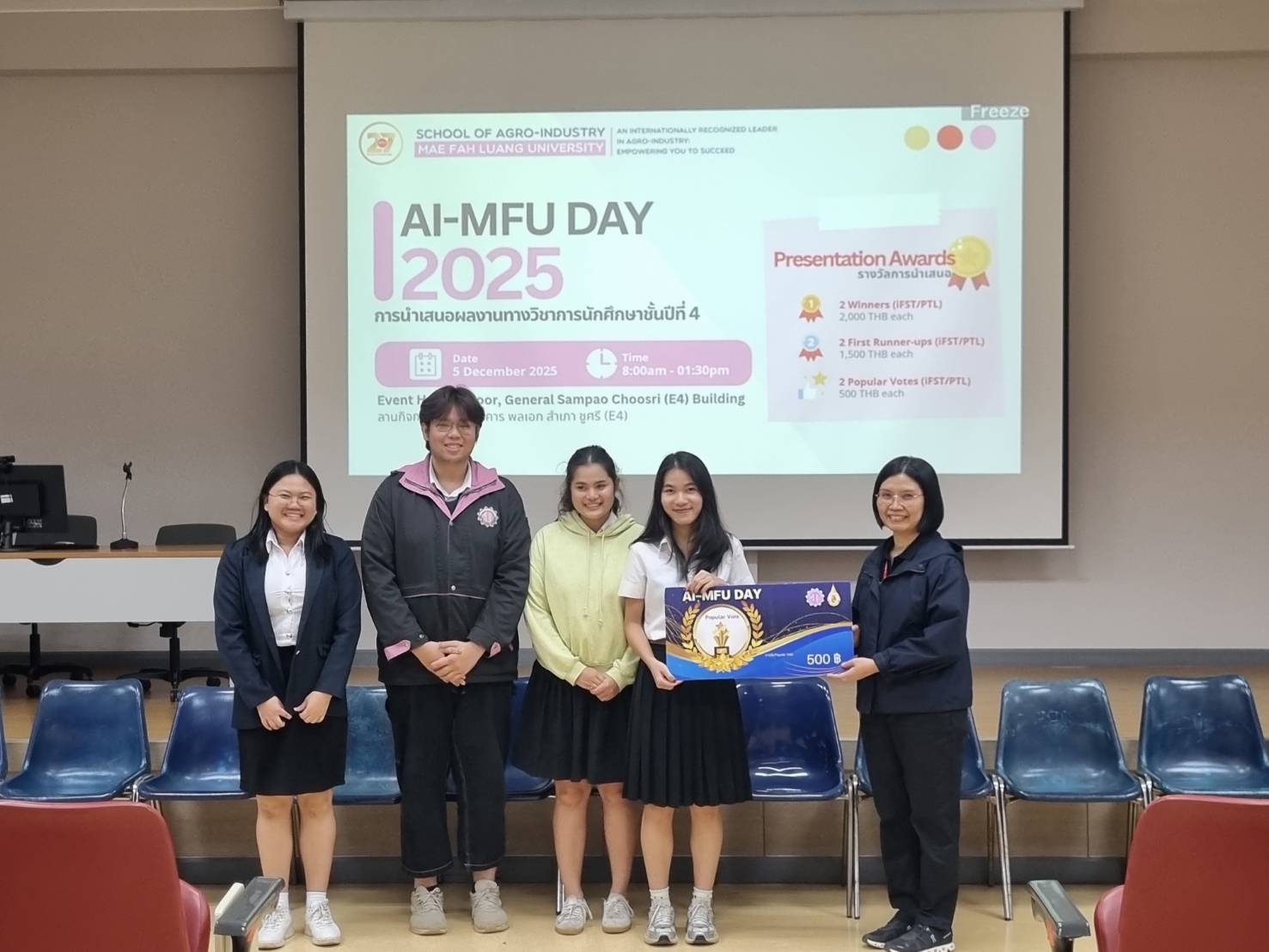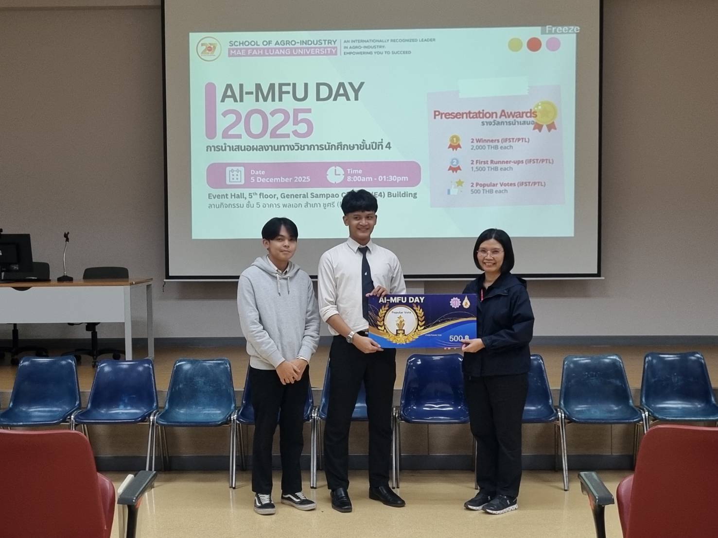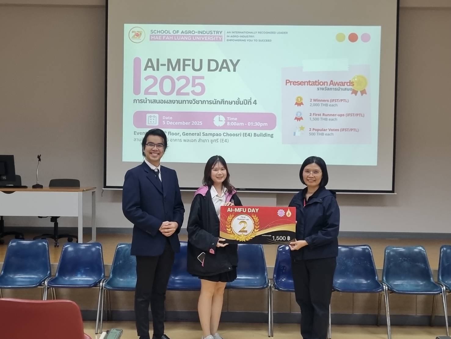 สำนักวิชาอุตสาหกรรมเกษตร มหาวิทยาลัยแม่ฟ้าหลวง จัดกิจกรรม AI-MFU DAY 2025 เพื่อนำเสนอผลงานวิชาการของนักศึกษาชั้นปีที่ 4 ประจำปีการศึกษา 2568 เมื่อวันที่ 5 ธันวาคม 2568 ณ ลานกิจกรรม ชั้น 5 อาคารพลเอก สำเภา ชูศรี (E4) โดยบรรยากาศภายในงานเป็นไปอย่างเข้มข้นและสร้างสรรค์ สะท้อนให้เห็นถึงศักยภาพของนักศึกษาในการพัฒนาองค์ความรู้ด้านอุตสาหกรรมเกษตรสู่ระดับสากล ภายในงานมีการประกาศผลรางวัลผลงานนำเสนอยอดเยี่ยม (Presentation Awards) ประจำปีการศึกษา 2568 ซึ่งมีรายชื่อนักศึกษาที่ได้รับรางวัล ดังนี้