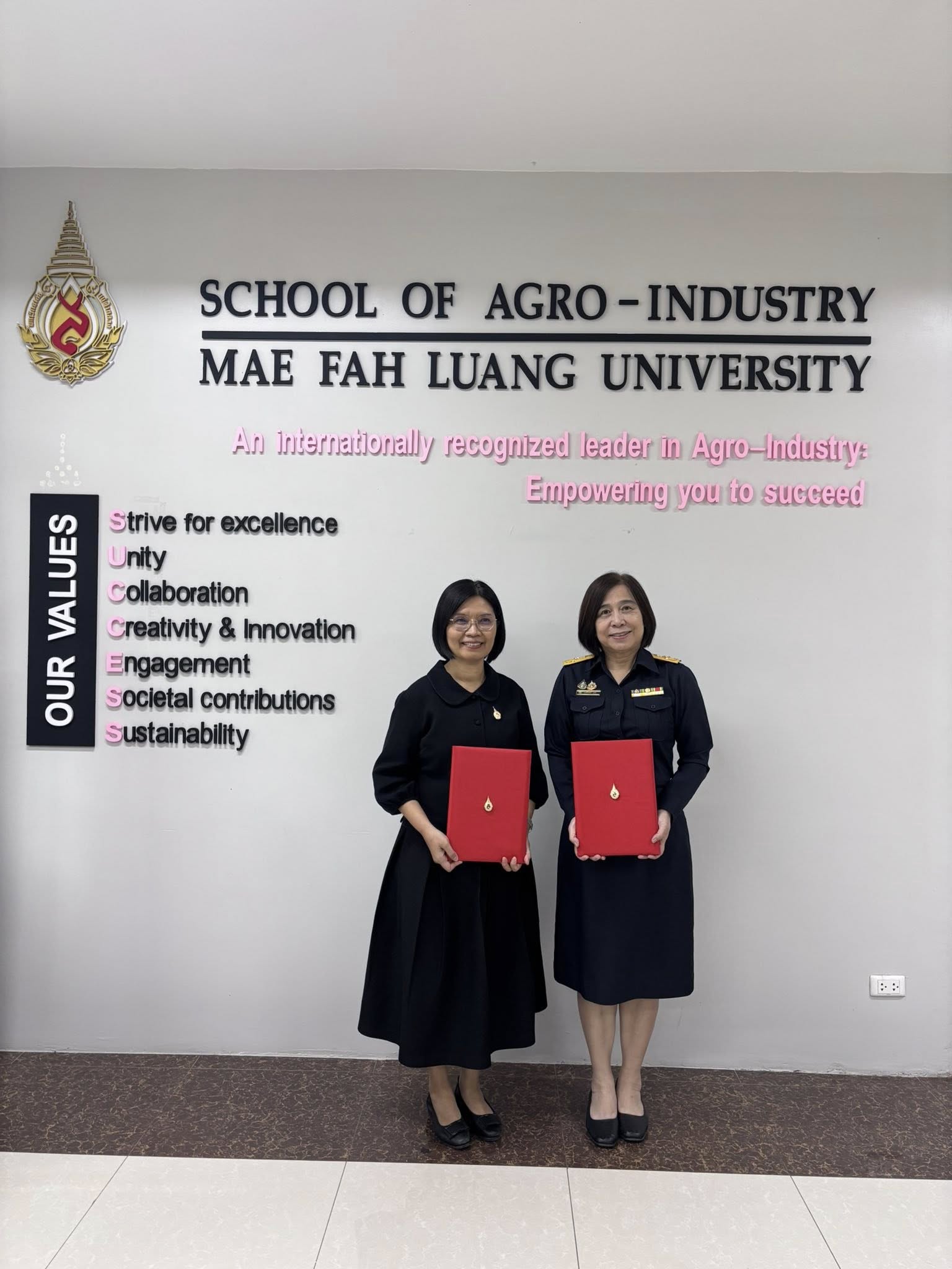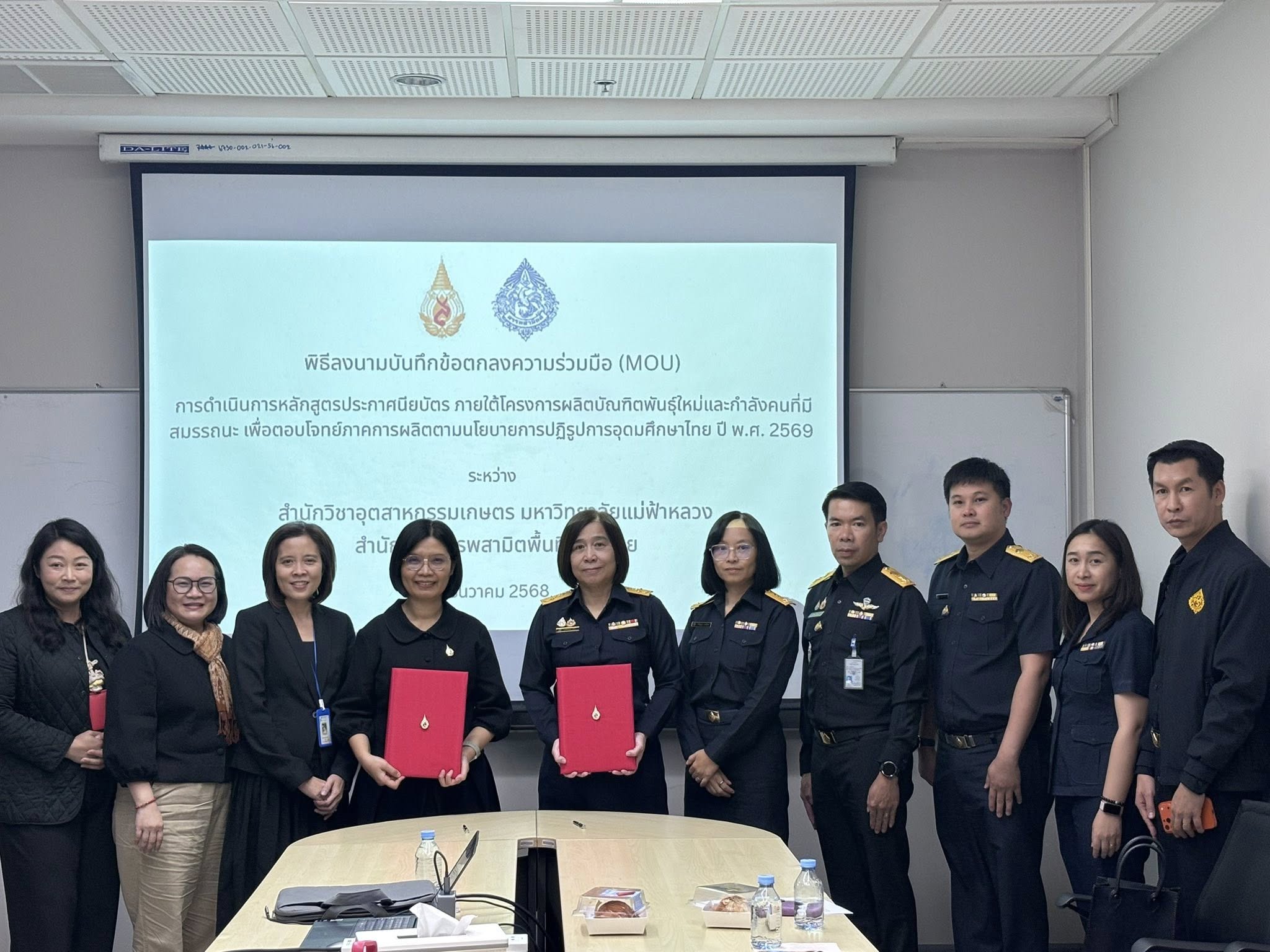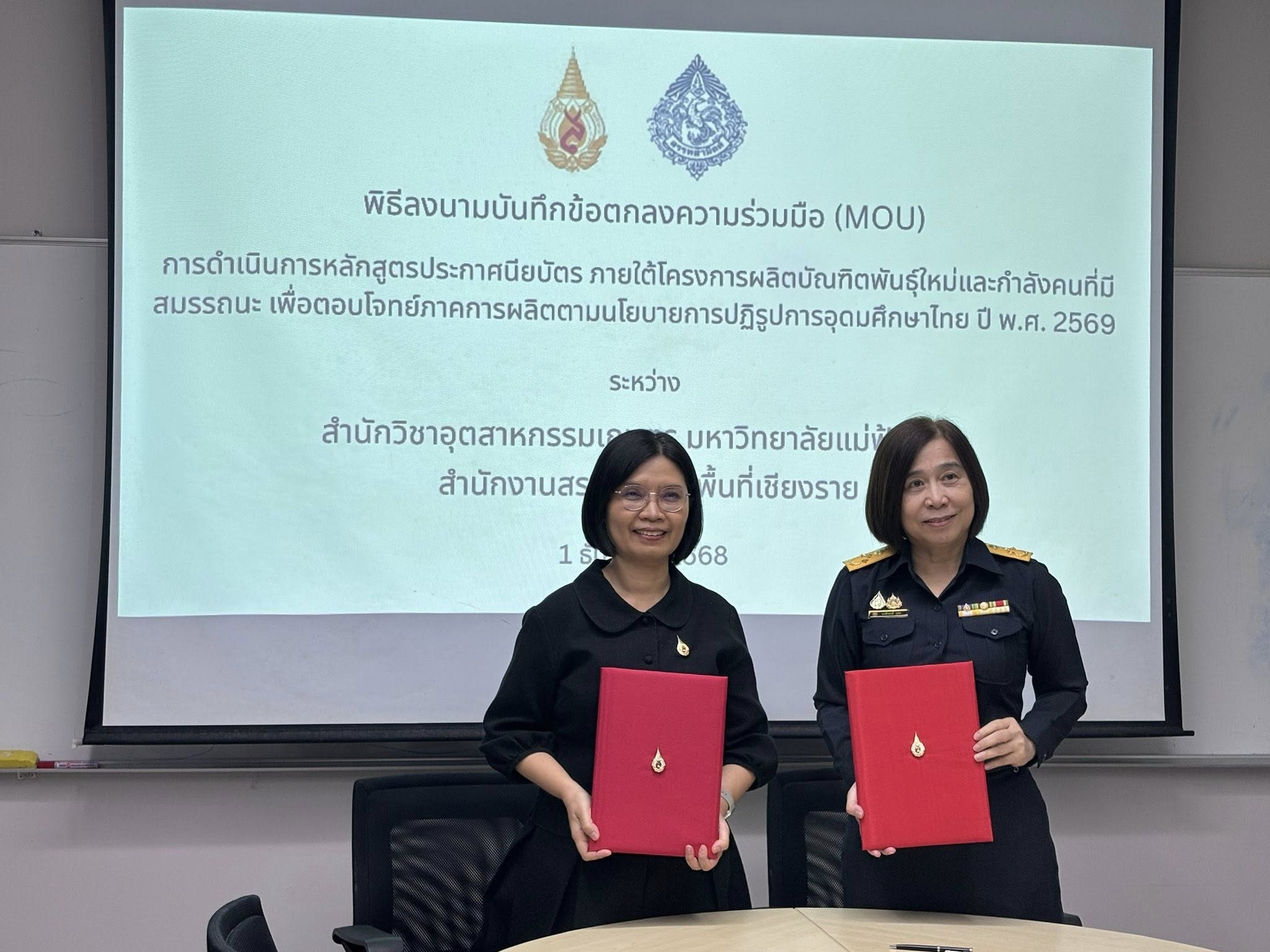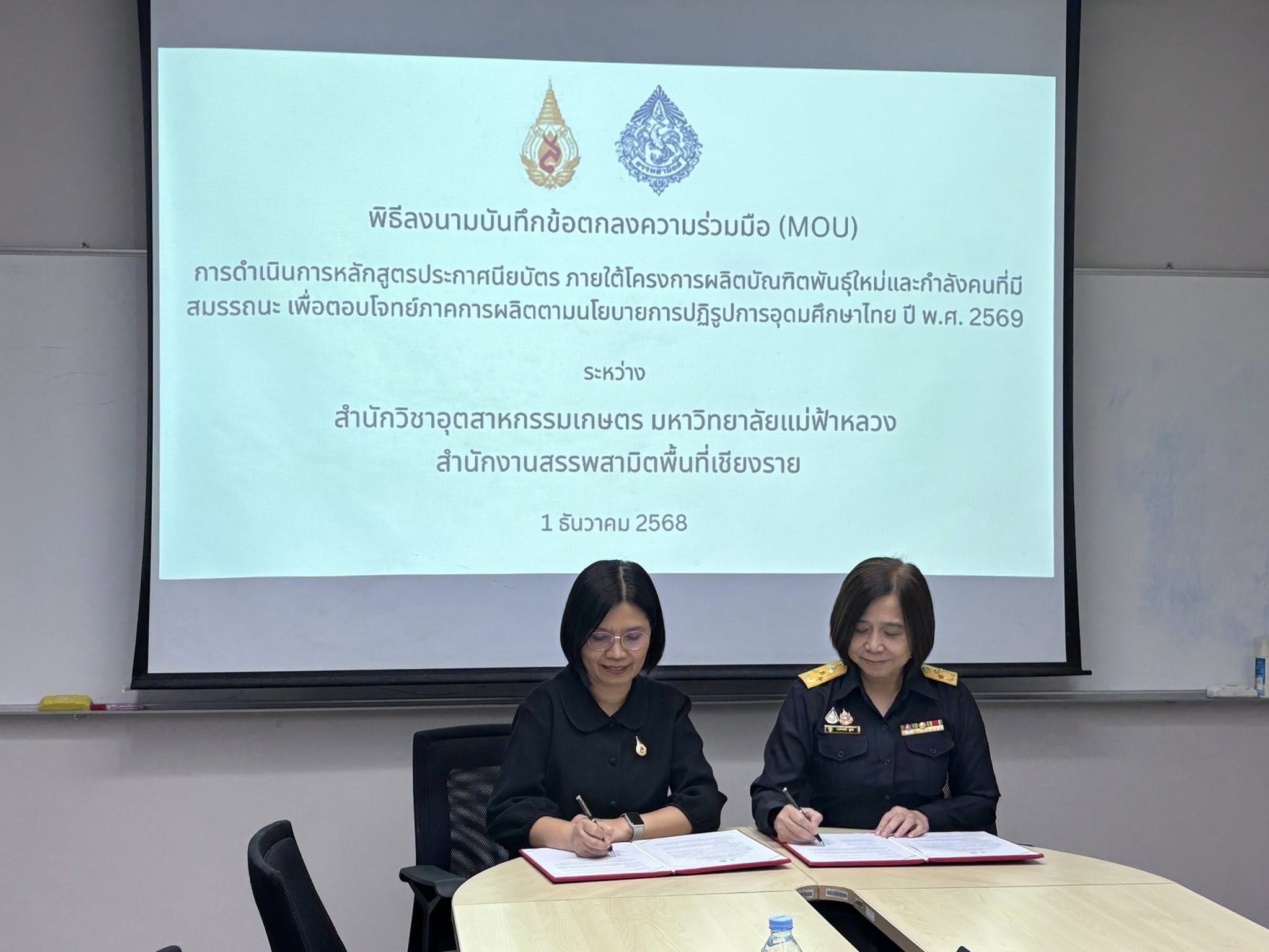 สำนักวิชาอุตสาหกรรมเกษตร มหาวิทยาลัยแม่ฟ้าหลวง โดย ผศ. ดร. สุทธิวัลย์ สีทา คณบดี และสำนักงานสรรพสามิตพื้นที่เชียงราย โดยคุณ นงลักษ์ กุศล ได้หารือและร่วมลงนามบันทึกข้อตกลงความร่วมมือทางวิชาการ (MOU) เพื่อจัดทำหลักสูตรประกาศนียบัตร ภายใต้โครงการผลิตบัณฑิตพันธุ์ใหม่และกำลังคนที่มีสมรรถนะ เพื่อตอบโจทย์ภาคการผลิตตามนโยบายการปฏิรูปการอุดมศึกษาไทย ปี พ.ศ. 2569 ได้แก่ หลักสูตร “การผลิตเครื่องดื่มแอลกอฮอล์เชิงพาณิชย์และการควบคุมมาตรฐาน (Commercial Alcoholic Beverage Production and Regulatory Compliance)” ซึ่งหลักสูตรได้รับการอนุมัติ “ผ่าน” จากสำนักงานปลัดกระทรวงการอุดมศึกษา วิทยาศาสตร์ วิจัยและนวัตกรรม (สป.อว.) เมื่อวันที่ 19 กุมภาพันธ์ 2569
